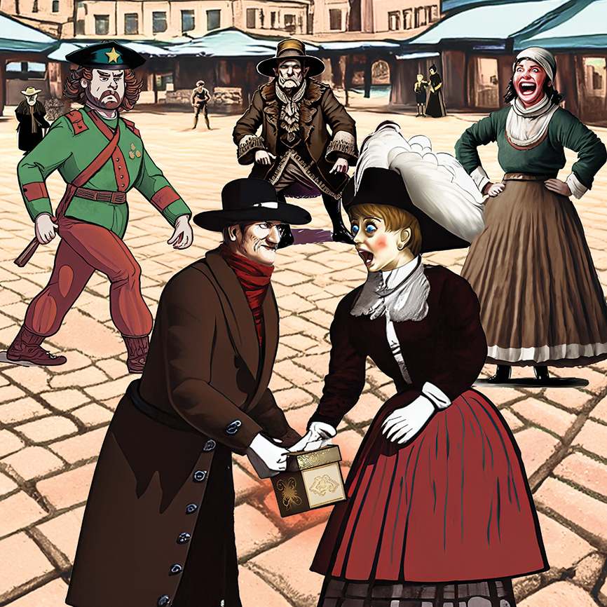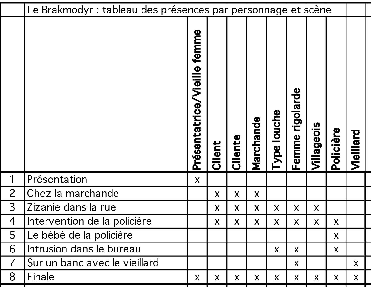 Voici un texte à canevas visant à perfectionner la gestuelle, l’expression émotionnelle et l’utilisation d’une palette variée de tonalités par les comédiens et comédiennes. L’intrigue tourne autour d’une marchande qui, pour punir un client désagréable, lui vend un objet mystérieux suscitant la convoitise de tous ceux qui le regardent. Cet objet, changeant de mains en mains, sème le désordre partout où il va. Seuls deux vieillards détiennent le savoir nécessaire pour détruire cette malédiction.