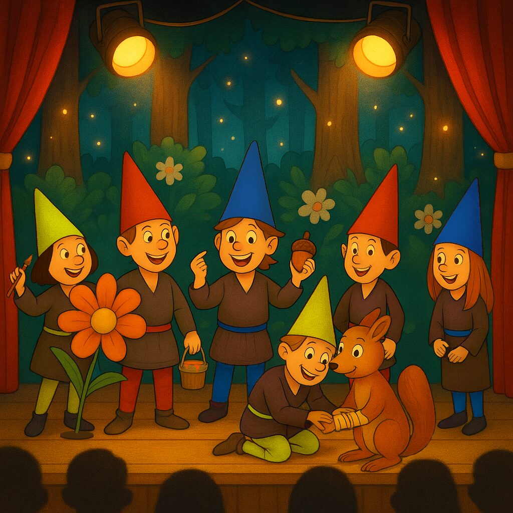 Plusieurs gnomes partent ensemble. Ils pourront revenir rapidement. Il s’agit d’une pièce de théâtre pour débutants.