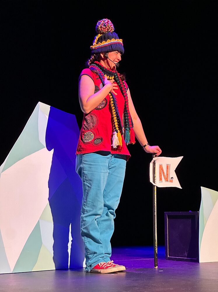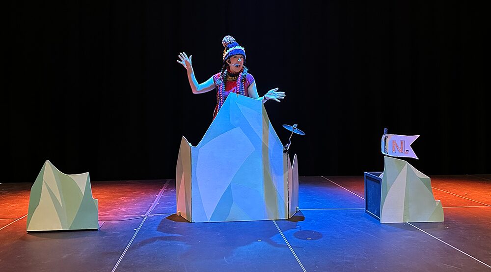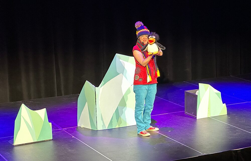 Ce spectacle pour enfants extérieur a été conçu dans le cadre de la pandémie alors qu’il était seulement permis de présenter dehors. Nous avons donc opté pour un décor minimal, mais efficace et coloré. De même, le rythme est extrêmement dynamique. Comme on est au froid, les enfants ne doivent pas rester assis trop longtemps. Alors, on bouge beaucoup; on chante, on danse, on imite la marionnette… À tous les deux minutes, on change d’activités. Même les plus petits sont interpelés.